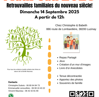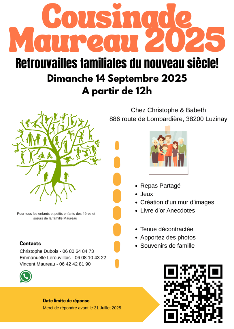 Pour faire de cet événement une réussite, merci de confirmer votre présence avant le 31 juillet 2025. Nous invitons tous les enfants et petits-enfants des frères et sœurs de la famille Maureau à se joindre à cette célébration pour renforcer notre famille. Pour des questions, ou plus de détails, n'hésitez pas à contacter Christophe Dubois au 06 80 64 84 73, Emmanuelle Lerouvillois au 06 08 10 43 22, ou Vincent Maureau au 06 42 42 81 90.